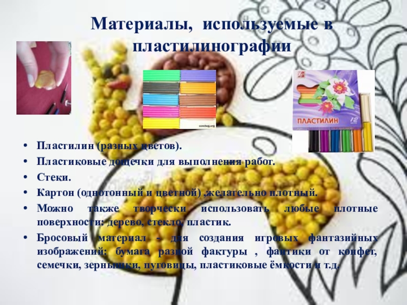 Материалы, используемые в пластилинографииПластилин (разных цветов).Пластиковые дощечки для выполнения работ.Стеки.Картон (однотонный и цветной) ,желательно плотный. Можно также
