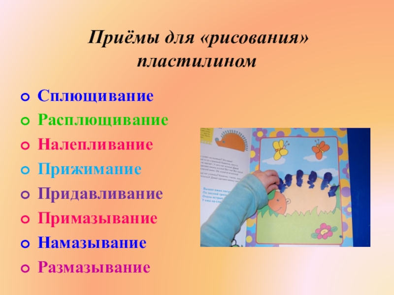 Приёмы для «рисования» пластилином СплющиваниеРасплющиваниеНалепливаниеПрижиманиеПридавливаниеПримазываниеНамазываниеРазмазывание