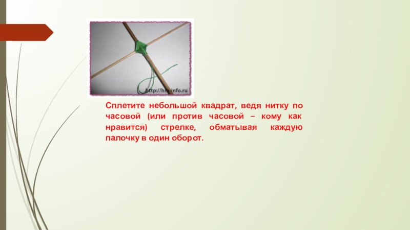 Слайд 21Сплетите небольшой квадрат, ведя нитку по часовой (или против часовой –