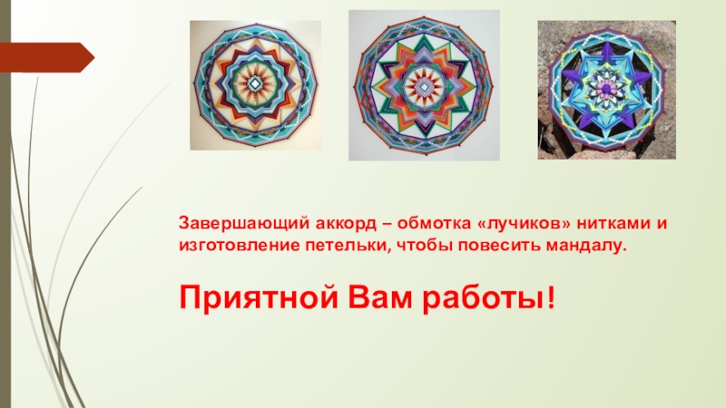 Слайд 24Завершающий аккорд – обмотка «лучиков» нитками и изготовление петельки, чтобы повесить