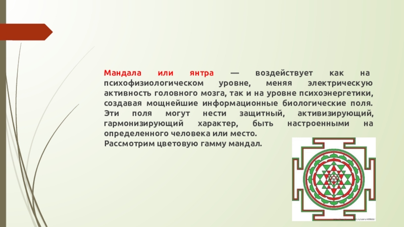 Слайд 11Мандала или янтра — воздействует как на психофизиологическом уровне, меняя электрическую