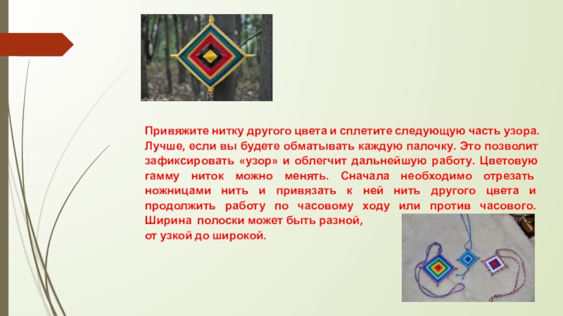вы будете обматывать каждую палочку. Это позволит зафиксировать «узор» и облегчит дальнейшую работу. Цветовую гамму ниток можно менять. Сначала необходимо отрезать ножницами нить и привязать к ней нить другого цвета и продолжить работу по часовому ходу или против часового. Ширина полоски может быть разной,