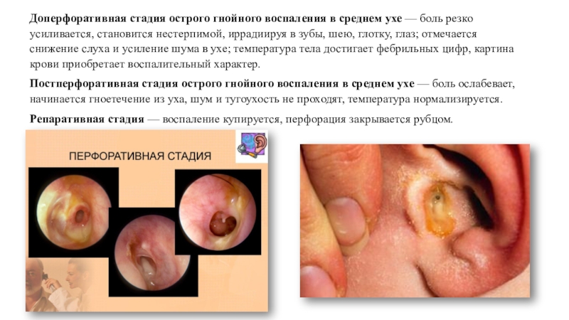 Слайд 6Доперфоративная стадия острого гнойного воспаления в среднем ухе — боль резко