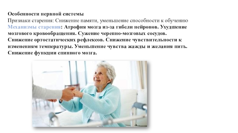 мозга из-за гибели нейронов. Ухудшение мозгового кровообращения. Сужение черепно-мозговых сосудов. Снижение ортостатических рефлексов. Снижение чувствительности к изменениям температуры. Уменьшение чувства жажды и желания пить. Снижение функции спинного мозга.