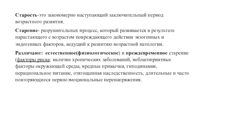 Слайд 9Старость-это закономерно наступающий заключительный период возрастного развития.