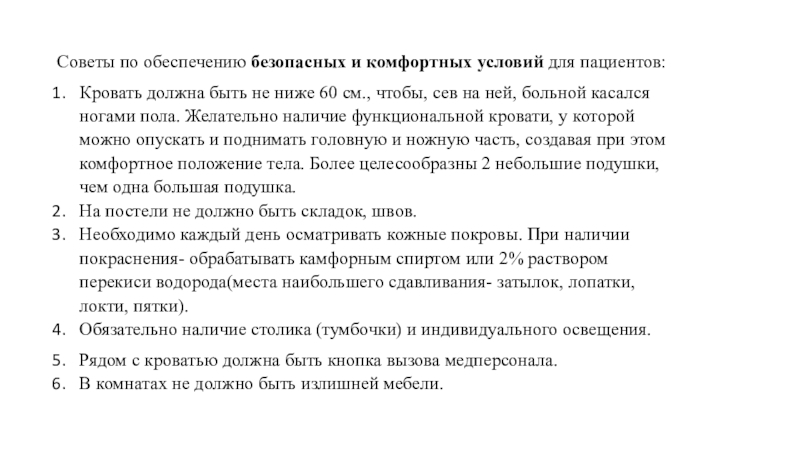 Слайд 13Советы по обеспечению безопасных и комфортных условий для пациентов: