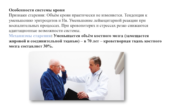 Механизмы старения: Уменьшается объём костного мозга (замещается жировой и соединительной тканью) – в 70 лет – кроветворная ткань костного мозга составляет 30%.