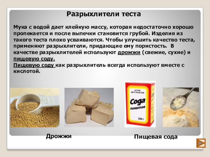 В качестве разрыхлителей для приготовления дрожжевого теста используют дрожжи и пищевую соду.