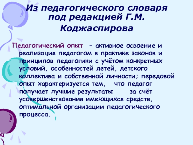 Педагогический опыт - активное освоение и реализация педагогом в практике законов и принципов педагогики с учётом конкретных условий, особенностей детей, детского коллектива и собственной личности; передовой опыт характеризуется тем, что педагог получает лучшие результаты за счёт усовершенствования имеющихся средств, оптимальной организации педагогического процесса.