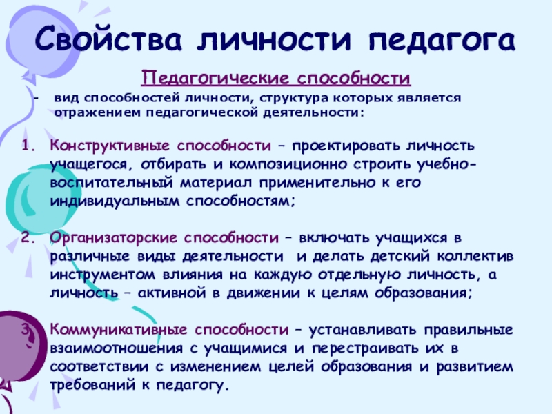 Конструктивные способности – проектировать личность учащегося, отбирать и композиционно строить учебно- воспитательный материал применительно к его индивидуальным способностям;