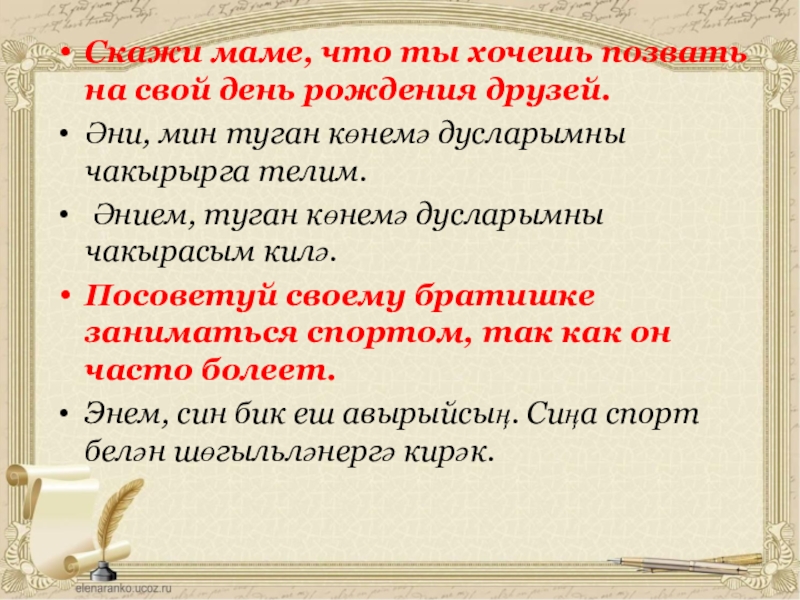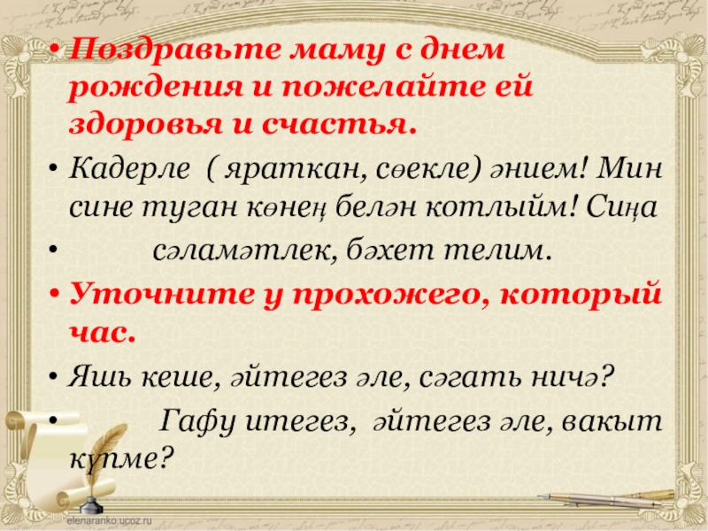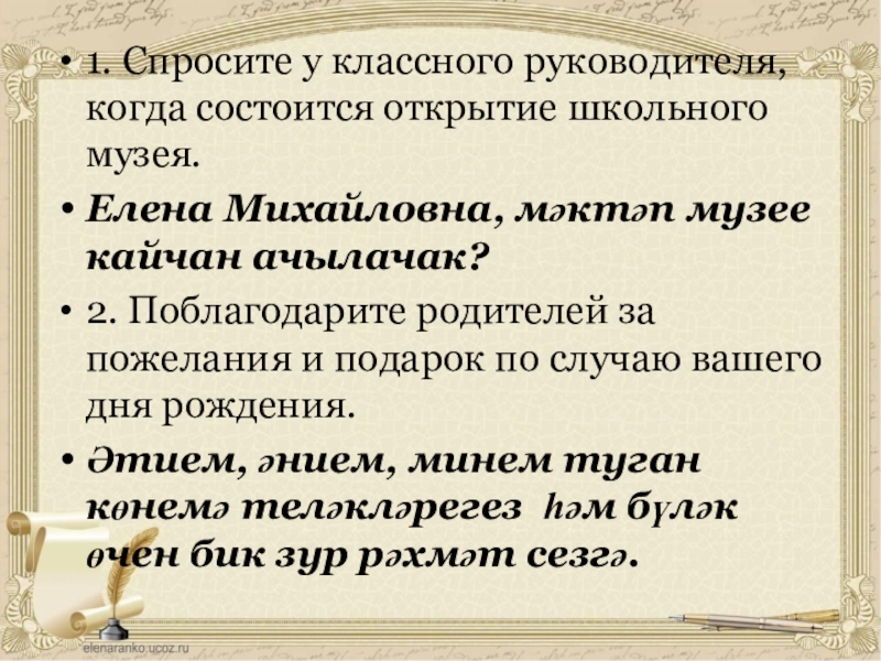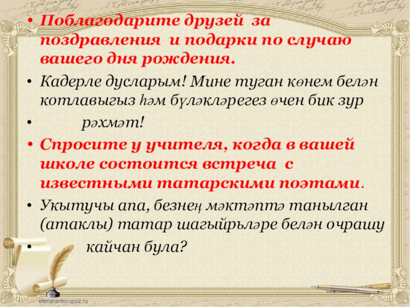 Әтием, әнием, минем туган көнемә теләкләрегез һәм бүләк өчен бик зур рәхмәт сезгә.
