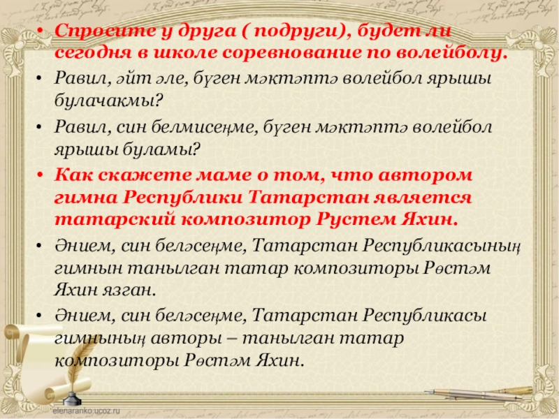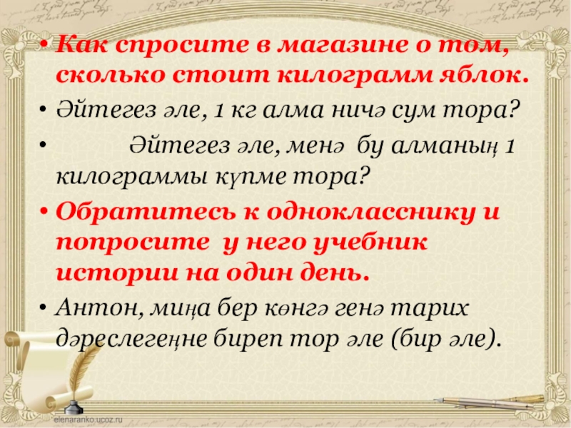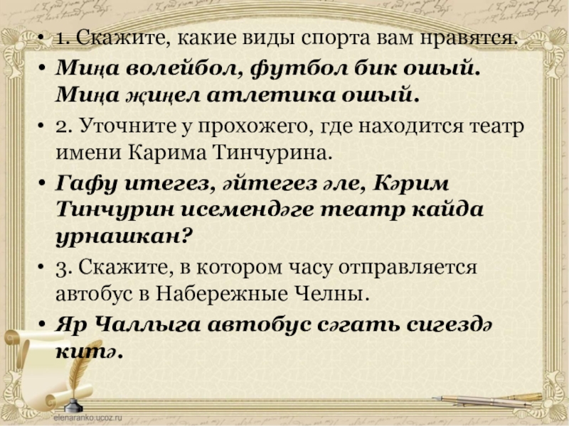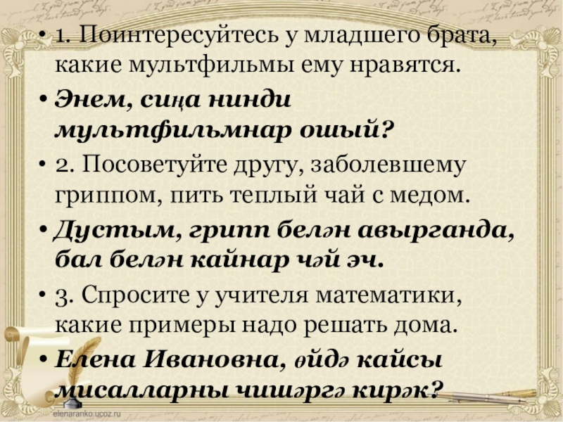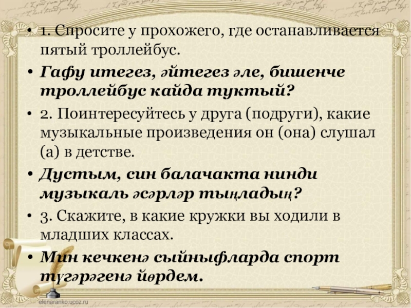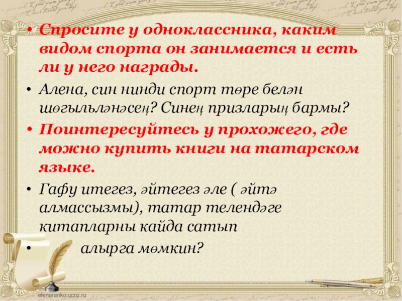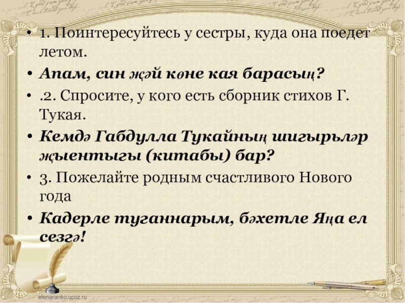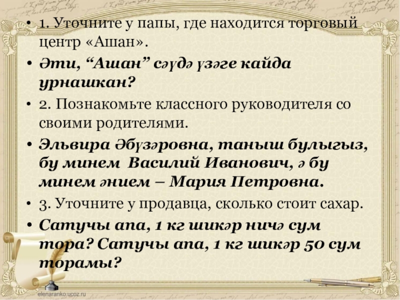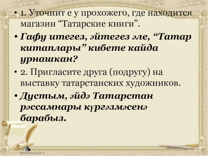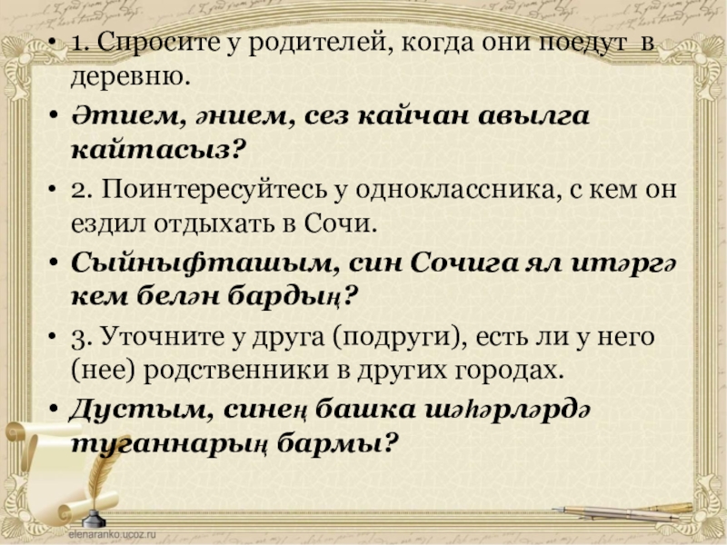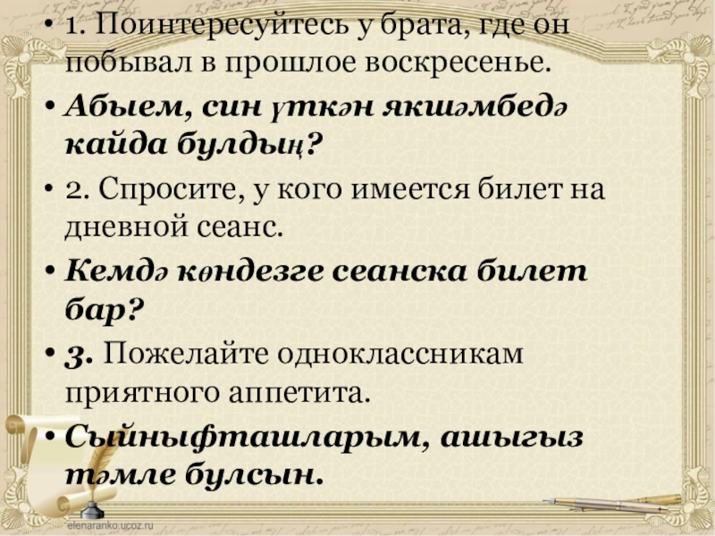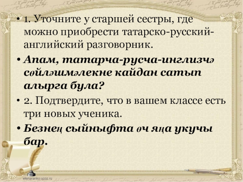 1. Уточните у старшей сестры, где можно приобрести татарско-русский-английский разговорник.