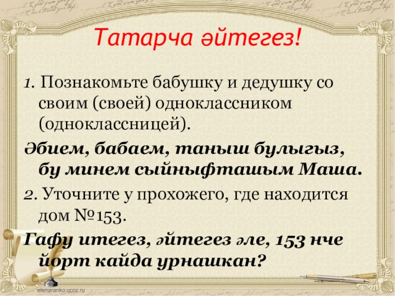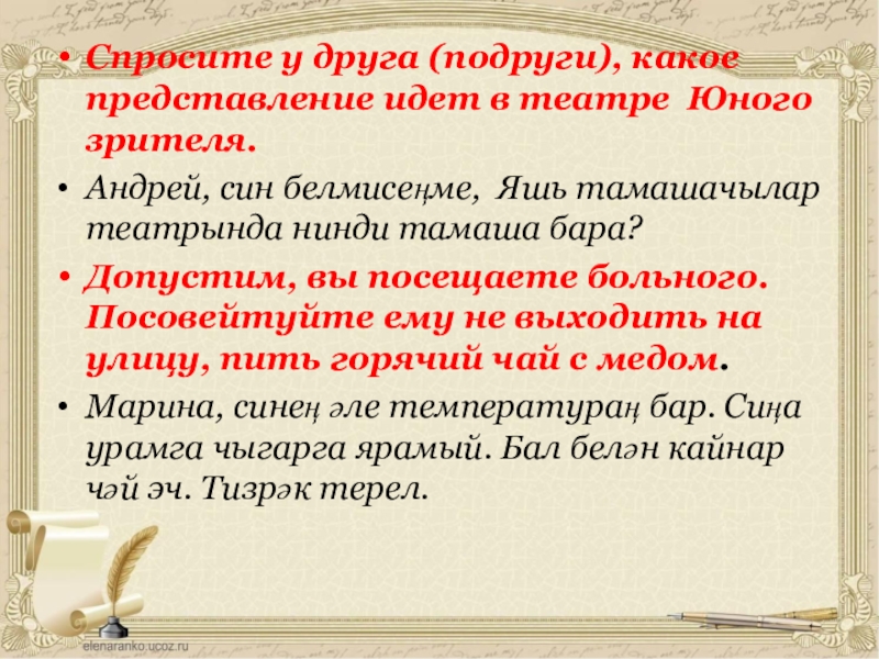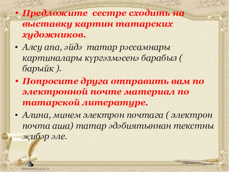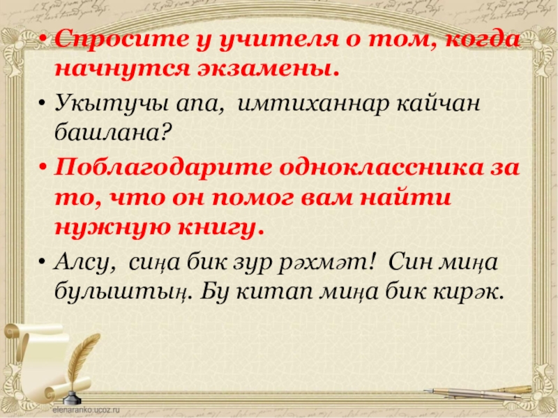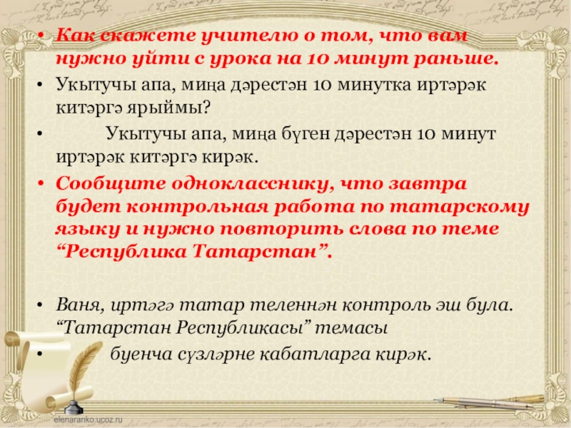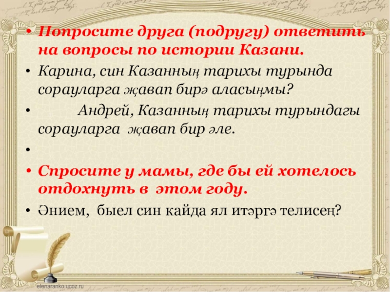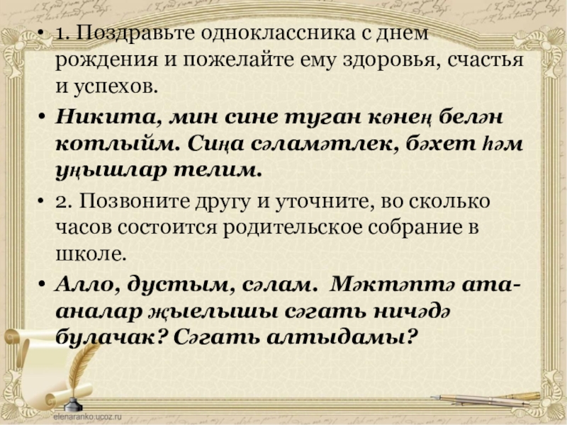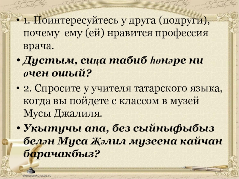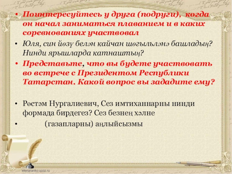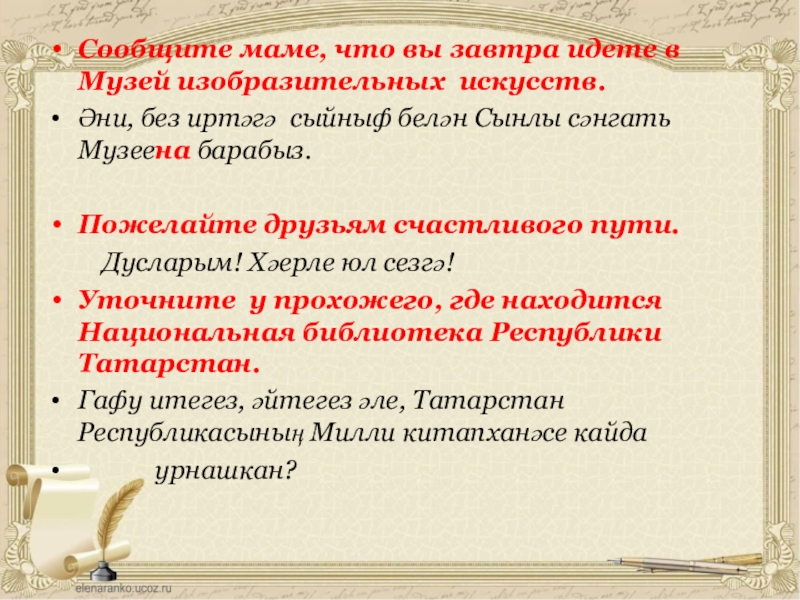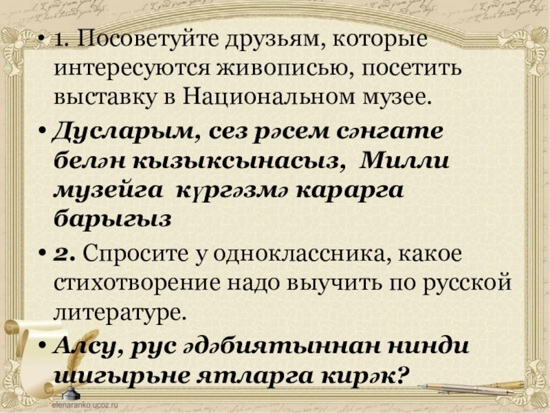 1. Уточните у старшей сестры, где можно приобрести татарско-русский-английский разговорник.