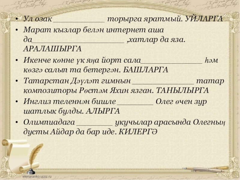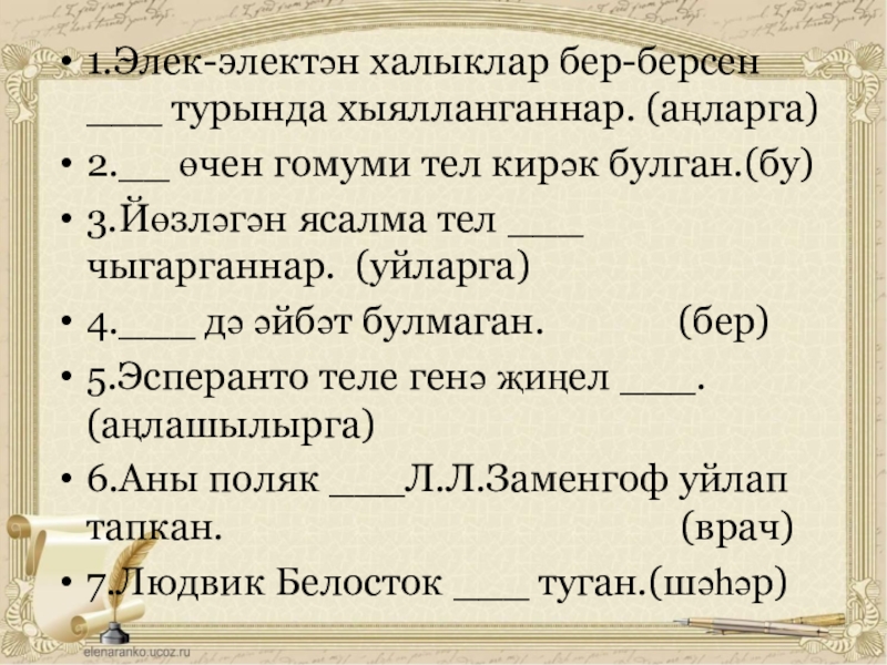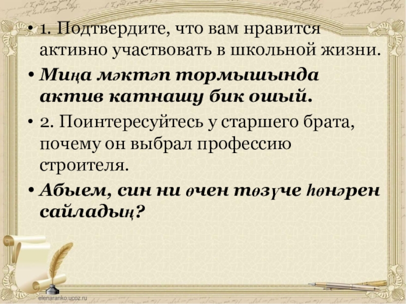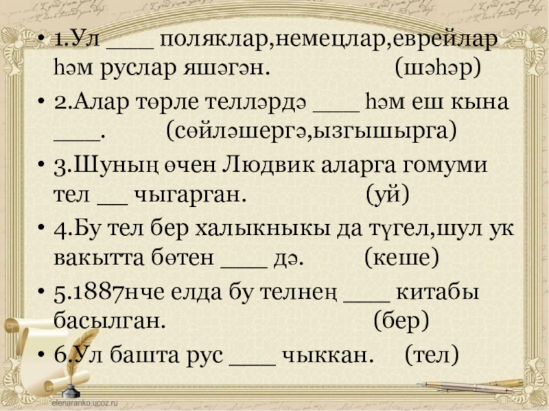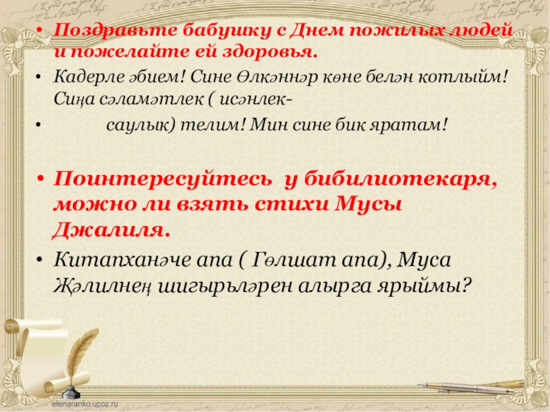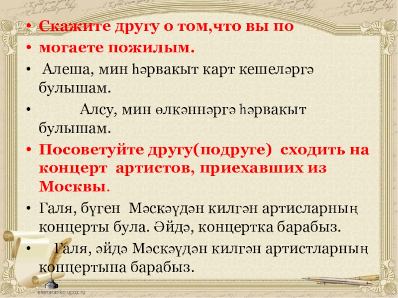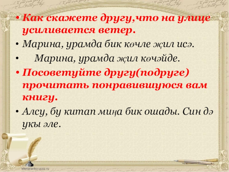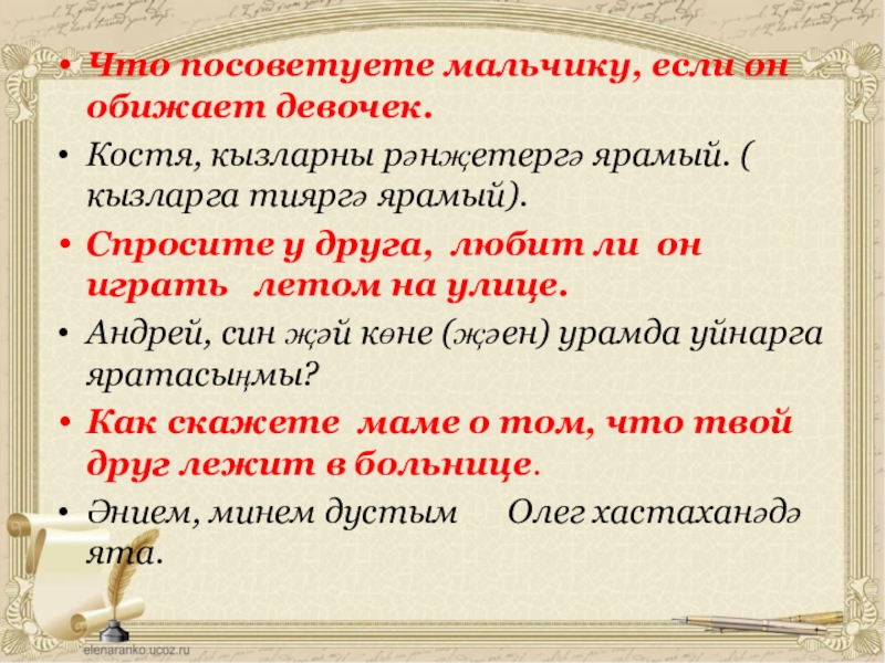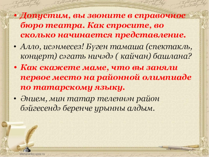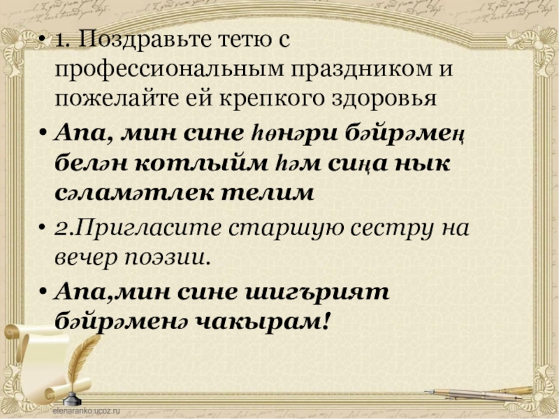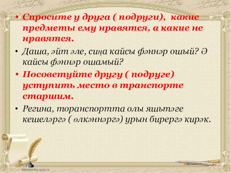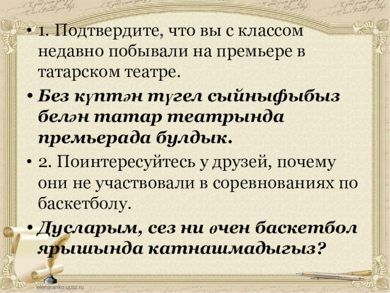 1. Уточните у старшей сестры, где можно приобрести татарско-русский-английский разговорник.