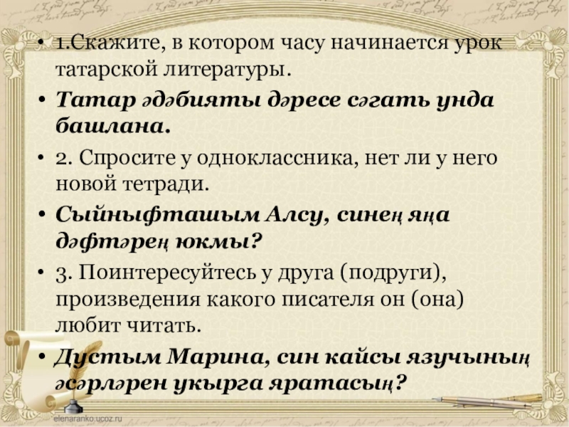 1.Скажите, в котором часу начинается урок татарской литературы.
