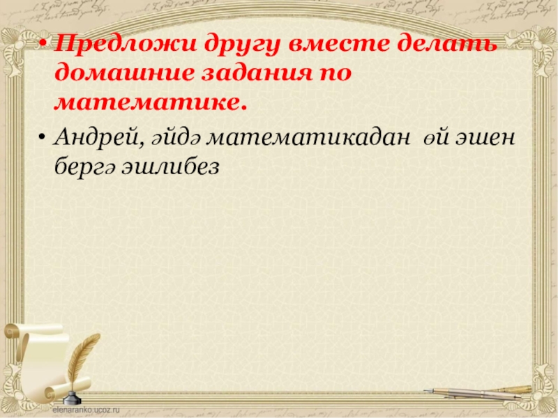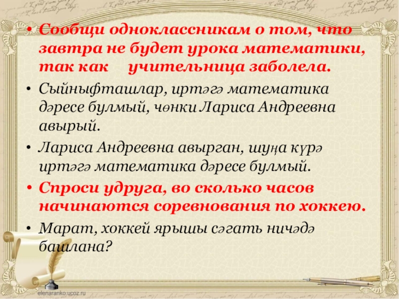 Сыйныфташлар, иртәгә математика дәресе булмый, чөнки Лариса Андреевна авырый.