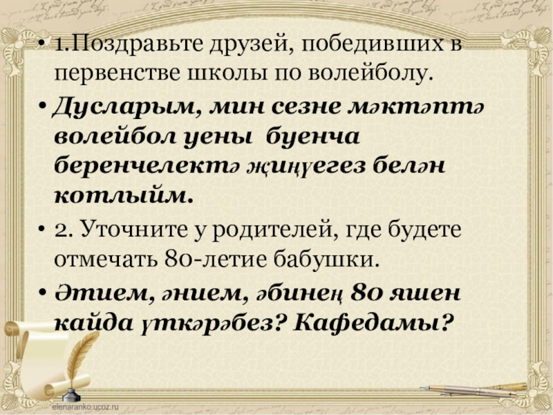 1.Поздравьте друзей, победивших в первенстве школы по волейболу.