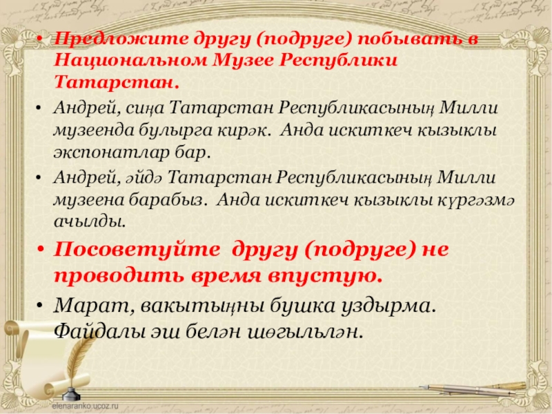 Предложите другу (подруге) побывать в Национальном Музее Республики Татарстан.