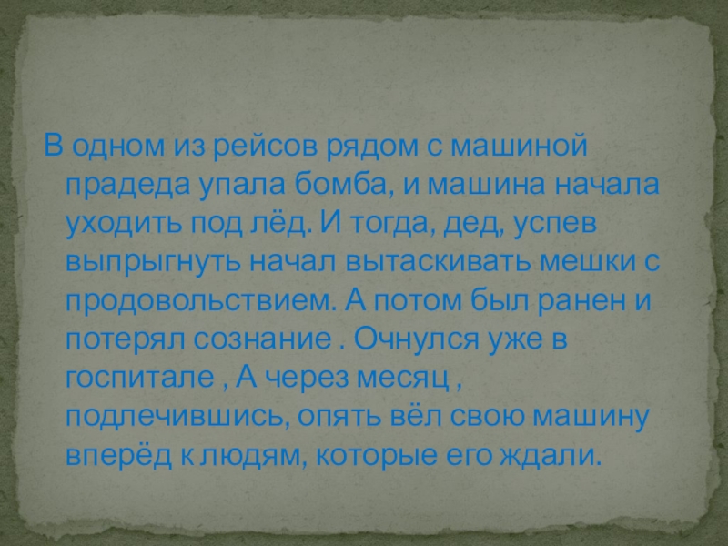 машина начала уходить под лёд. И тогда, дед, успев выпрыгнуть начал вытаскивать мешки с продовольствием. А потом был ранен и потерял сознание . Очнулся уже в госпитале , А через месяц , подлечившись, опять вёл свою машину вперёд к людям, которые его ждали.