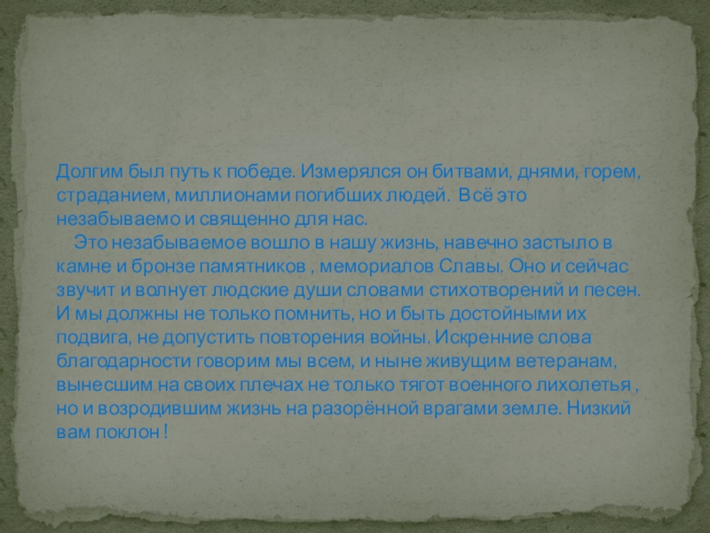 Слайд 19Долгим был путь к победе. Измерялся он битвами, днями, горем, страданием,
