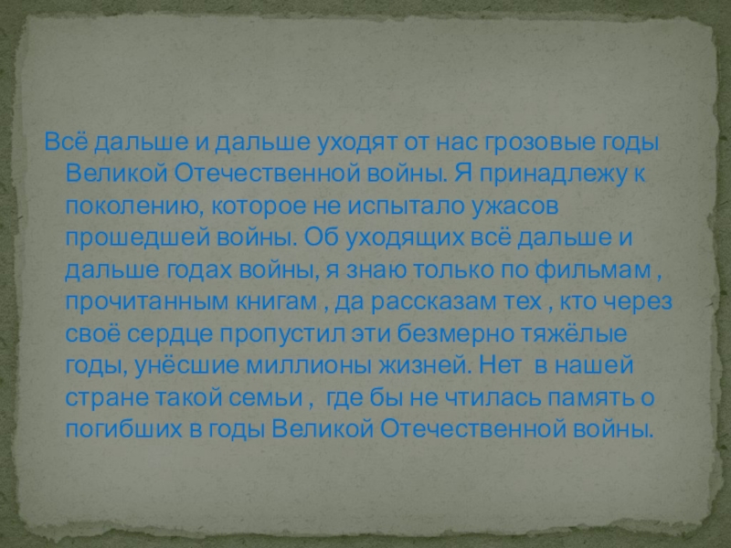 войны. Я принадлежу к поколению, которое не испытало ужасов прошедшей войны. Об уходящих всё дальше и дальше годах войны, я знаю только по фильмам , прочитанным книгам , да рассказам тех , кто через своё сердце пропустил эти безмерно тяжёлые годы, унёсшие миллионы жизней. Нет в нашей стране такой семьи , где бы не чтилась память о погибших в годы Великой Отечественной войны.