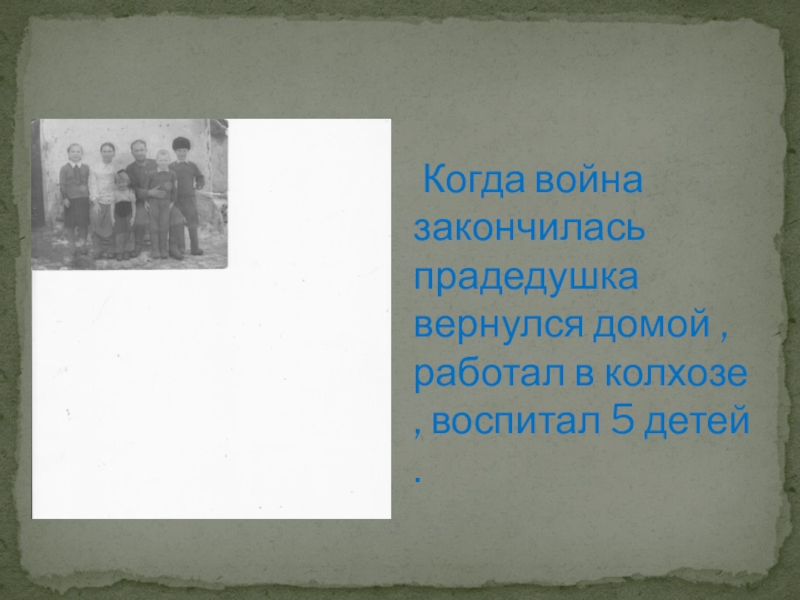 Слайд 15 Когда война закончилась прадедушка вернулся домой , работал в колхозе