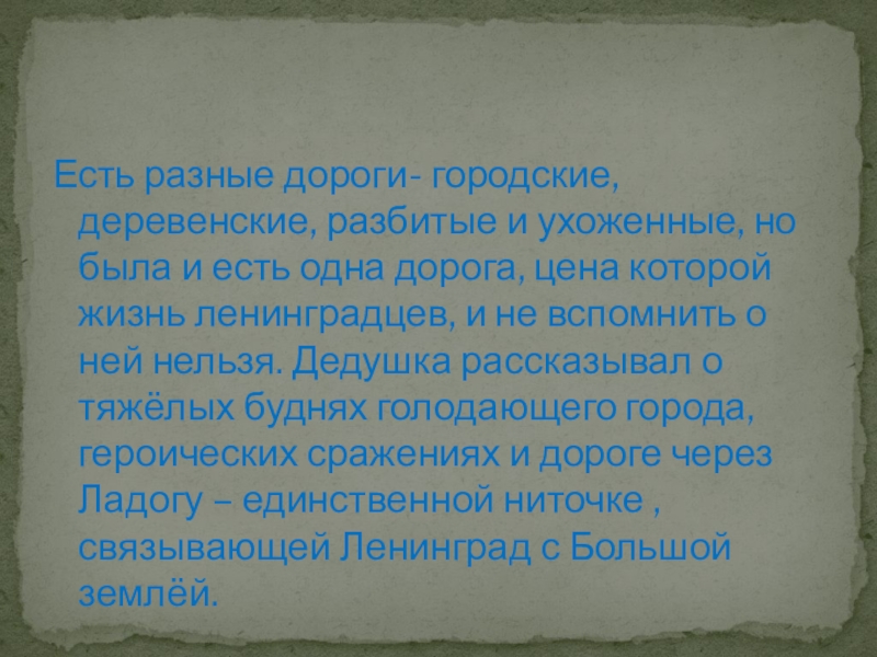 есть одна дорога, цена которой жизнь ленинградцев, и не вспомнить о ней нельзя. Дедушка рассказывал о тяжёлых буднях голодающего города, героических сражениях и дороге через Ладогу – единственной ниточке , связывающей Ленинград с Большой землёй.