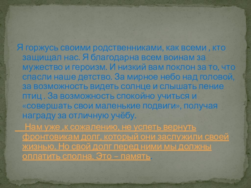 Нам уже ,к сожалению, не успеть вернуть фронтовикам долг, который они заслужили своей жизнью. Но свой долг перед ними мы должны оплатить сполна. Это – память.