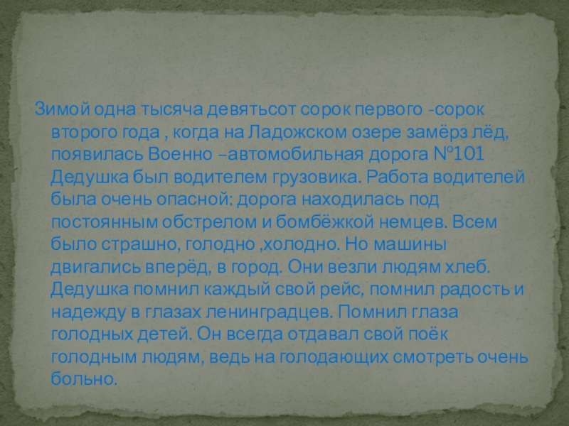 на Ладожском озере замёрз лёд, появилась Военно –автомобильная дорога №101 Дедушка был водителем грузовика. Работа водителей была очень опасной: дорога находилась под постоянным обстрелом и бомбёжкой немцев. Всем было страшно, голодно ,холодно. Но машины двигались вперёд, в город. Они везли людям хлеб. Дедушка помнил каждый свой рейс, помнил радость и надежду в глазах ленинградцев. Помнил глаза голодных детей. Он всегда отдавал свой поёк голодным людям, ведь на голодающих смотреть очень больно.