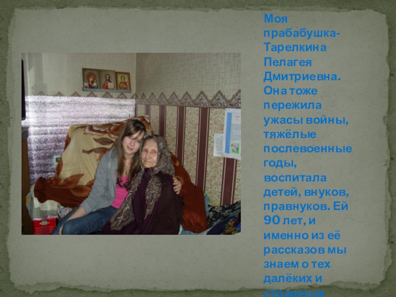 послевоенные годы, воспитала детей, внуков, правнуков. Ей 90 лет, и именно из её рассказов мы знаем о тех далёких и страшных временах.