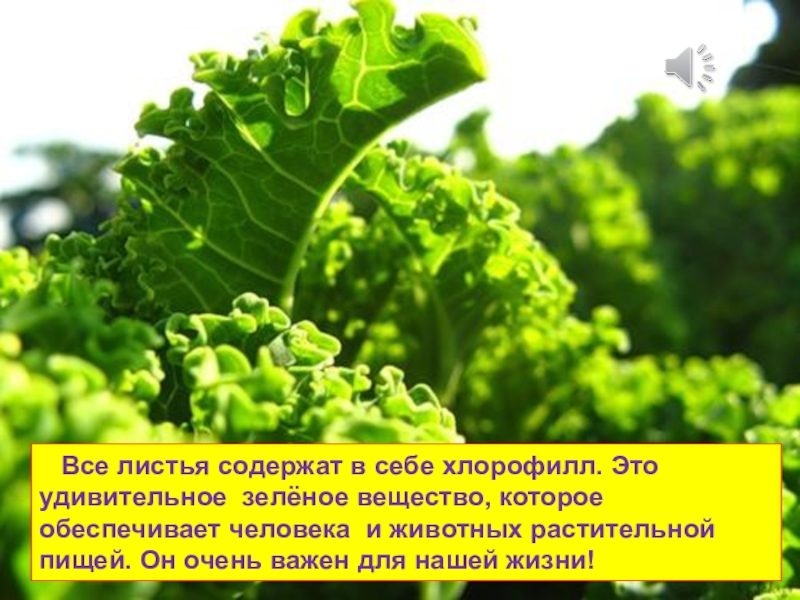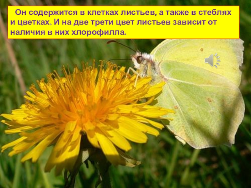 Слайд 7 Он содержится в клетках листьев, а также в стеблях и