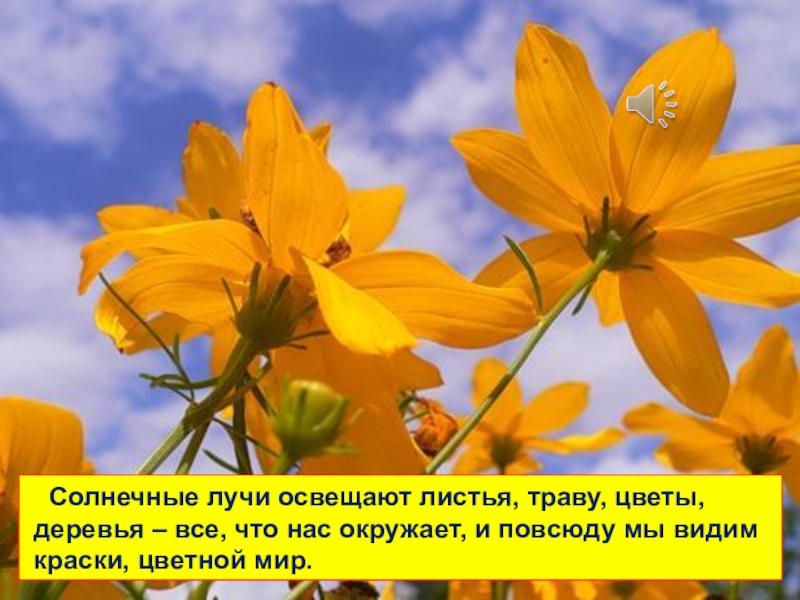 Слайд 2 Солнечные лучи освещают листья, траву, цветы,