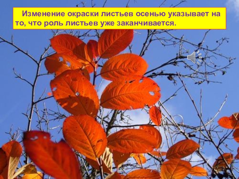 Слайд 17 Изменение окраски листьев осенью указывает на то, что роль