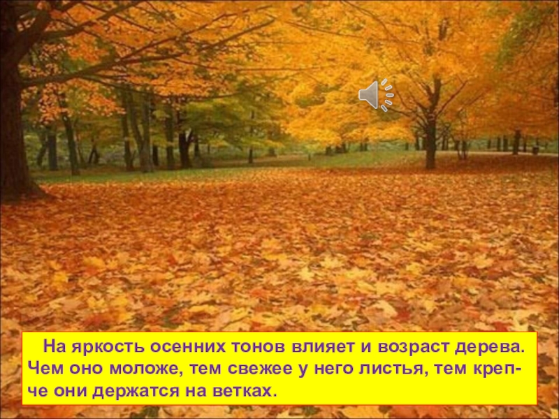 Слайд 26 На яркость осенних тонов влияет и возраст дерева. Чем