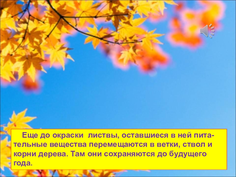 Слайд 15 Еще до окраски листвы, оставшиеся в ней пита-тельные вещества