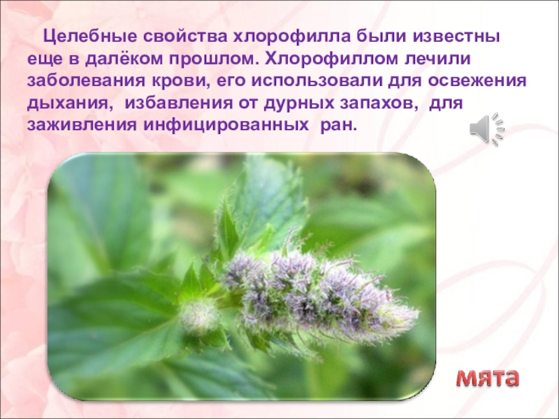 Хлорофиллом лечили заболевания крови, его использовали для освежения дыхания, избавления от дурных запахов, для заживления инфицированных ран.