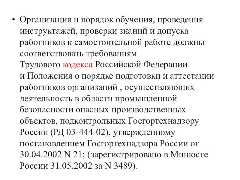 к самостоятельной работе должны соответствовать требованиям Трудового кодекса Российской Федерации и Положения о порядке подготовки и аттестации работников организаций , осуществляющих деятельность в области промышленной безопасности опасных производственных объектов, подконтрольных Госгортехнадзору России (РД 03-444-02), утвержденному постановлением Госгортехнадзора России от 30.04.2002 N 21; (зарегистрировано в Минюсте России 31.05.2002 за N 3489).