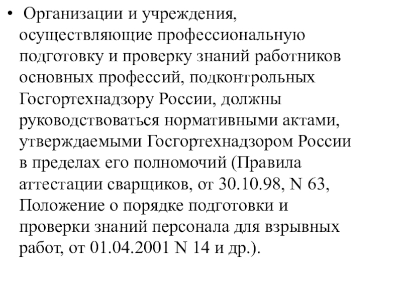 профессий, подконтрольных Госгортехнадзору России, должны руководствоваться нормативными актами, утверждаемыми Госгортехнадзором России в пределах его полномочий (Правила аттестации сварщиков, от 30.10.98, N 63, Положение о порядке подготовки и проверки знаний персонала для взрывных работ, от 01.04.2001 N 14 и др.).