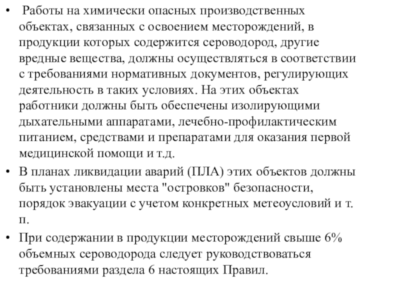 продукции которых содержится сероводород, другие вредные вещества, должны осуществляться в соответствии с требованиями нормативных документов, регулирующих деятельность в таких условиях. На этих объектах работники должны быть обеспечены изолирующими дыхательными аппаратами, лечебно-профилактическим питанием, средствами и препаратами для оказания первой медицинской помощи и т.д.