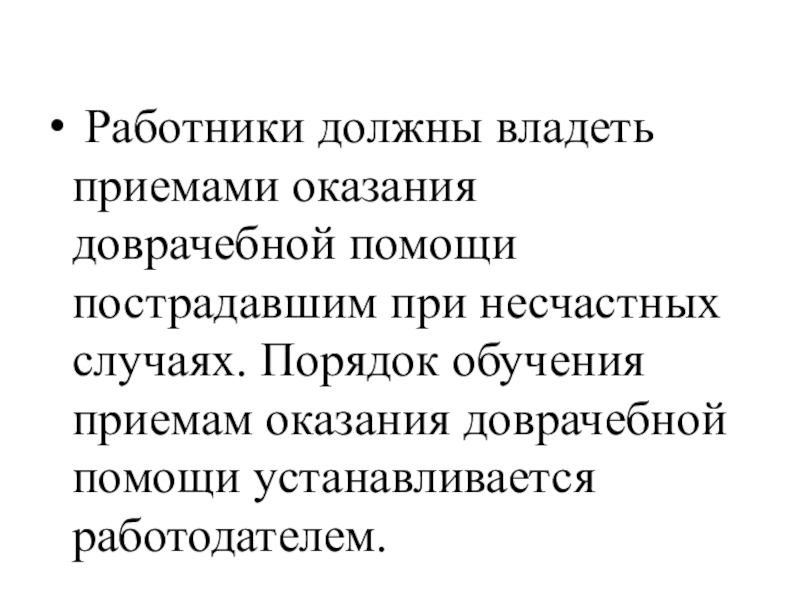 Слайд 8 Работники должны владеть приемами оказания доврачебной помощи пострадавшим при несчастных случаях.