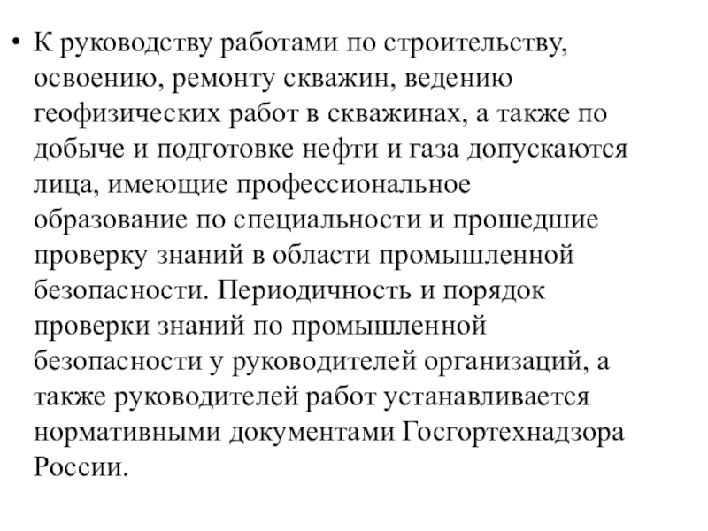 в скважинах, а также по добыче и подготовке нефти и газа допускаются лица, имеющие профессиональное образование по специальности и прошедшие проверку знаний в области промышленной безопасности. Периодичность и порядок проверки знаний по промышленной безопасности у руководителей организаций, а также руководителей работ устанавливается нормативными документами Госгортехнадзора России.
