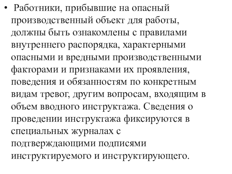 Слайд 14 Работники, прибывшие на опасный производственный объект для работы, должны быть ознакомлены