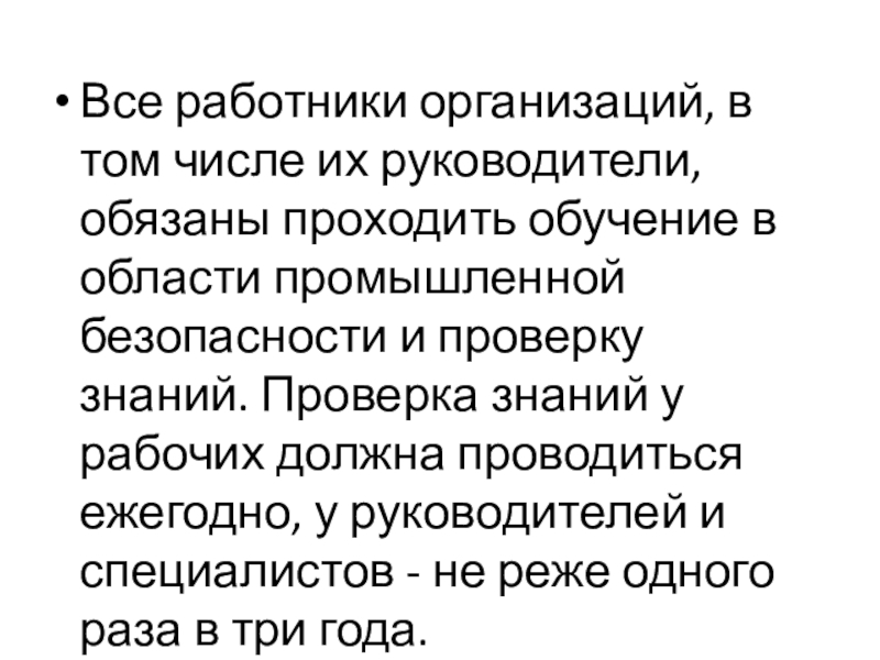 в области промышленной безопасности и проверку знаний. Проверка знаний у рабочих должна проводиться ежегодно, у руководителей и специалистов - не реже одного раза в три года.