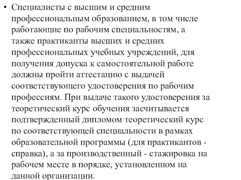 по рабочим специальностям, а также практиканты высших и средних профессиональных учебных учреждений, для получения допуска к самостоятельной работе должны пройти аттестацию с выдачей соответствующего удостоверения по рабочим профессиям. При выдаче такого удостоверения за теоретический курс обучения засчитывается подтвержденный дипломом теоретический курс по соответствующей специальности в рамках образовательной программы (для практикантов - справка), а за производственный - стажировка на рабочем месте в порядке, установленном на данной организации.