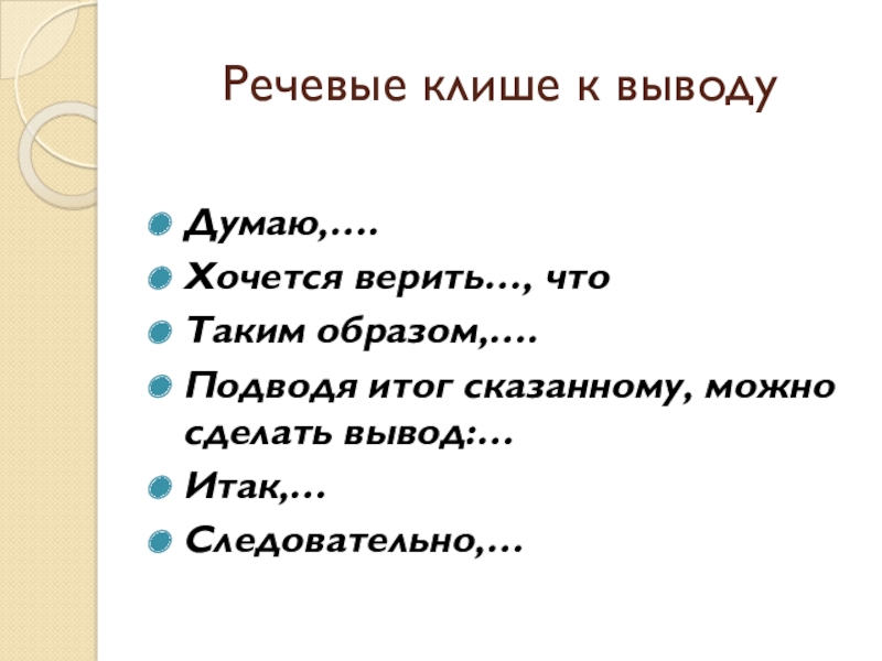 Слайд 12Речевые клише к выводу