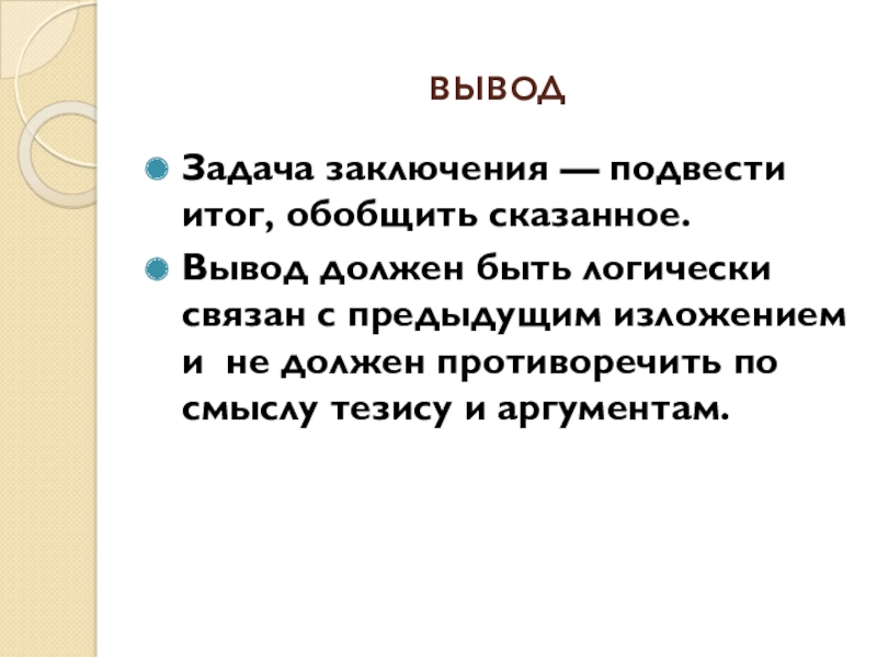 с предыдущим изложением и не должен противоречить по смыслу тезису и аргументам.