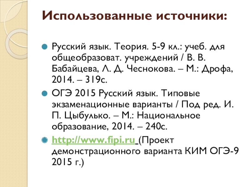 http://www.fipi.ru (Проект демонстрационного варианта КИМ ОГЭ-9 2015 г.)