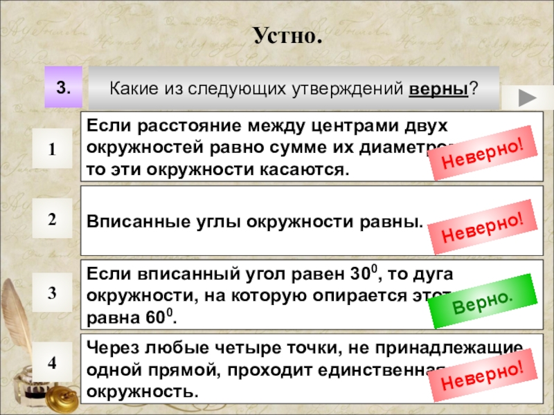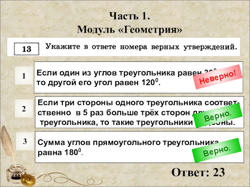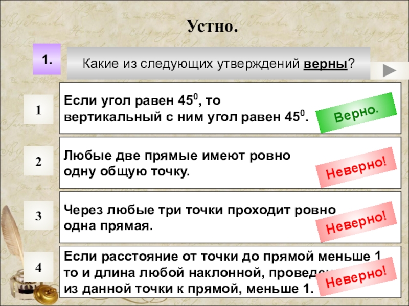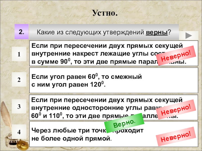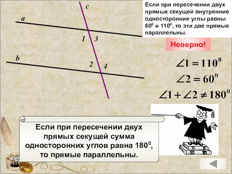 Если при пересечении двух прямых секущей внутренние накрест лежащие углы составляют в сумме 900, то эти две прямые параллельны.