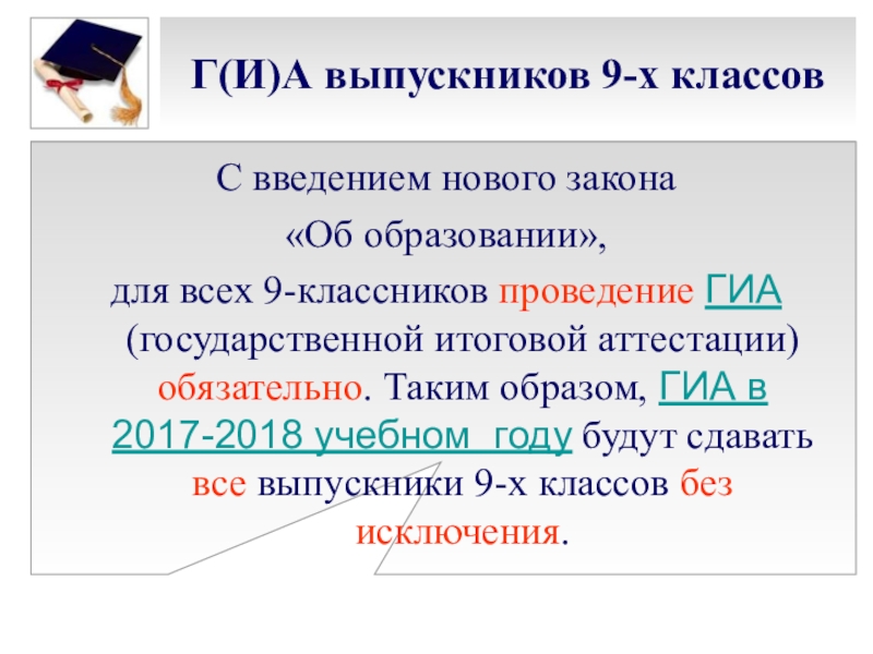 9-классников проведение ГИА (государственной итоговой аттестации) обязательно. Таким образом, ГИА в 2017-2018 учебном году будут сдавать все выпускники 9-х классов без исключения.