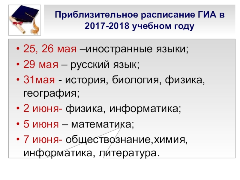 Слайд 29Приблизительное расписание ГИА в 2017-2018 учебном году